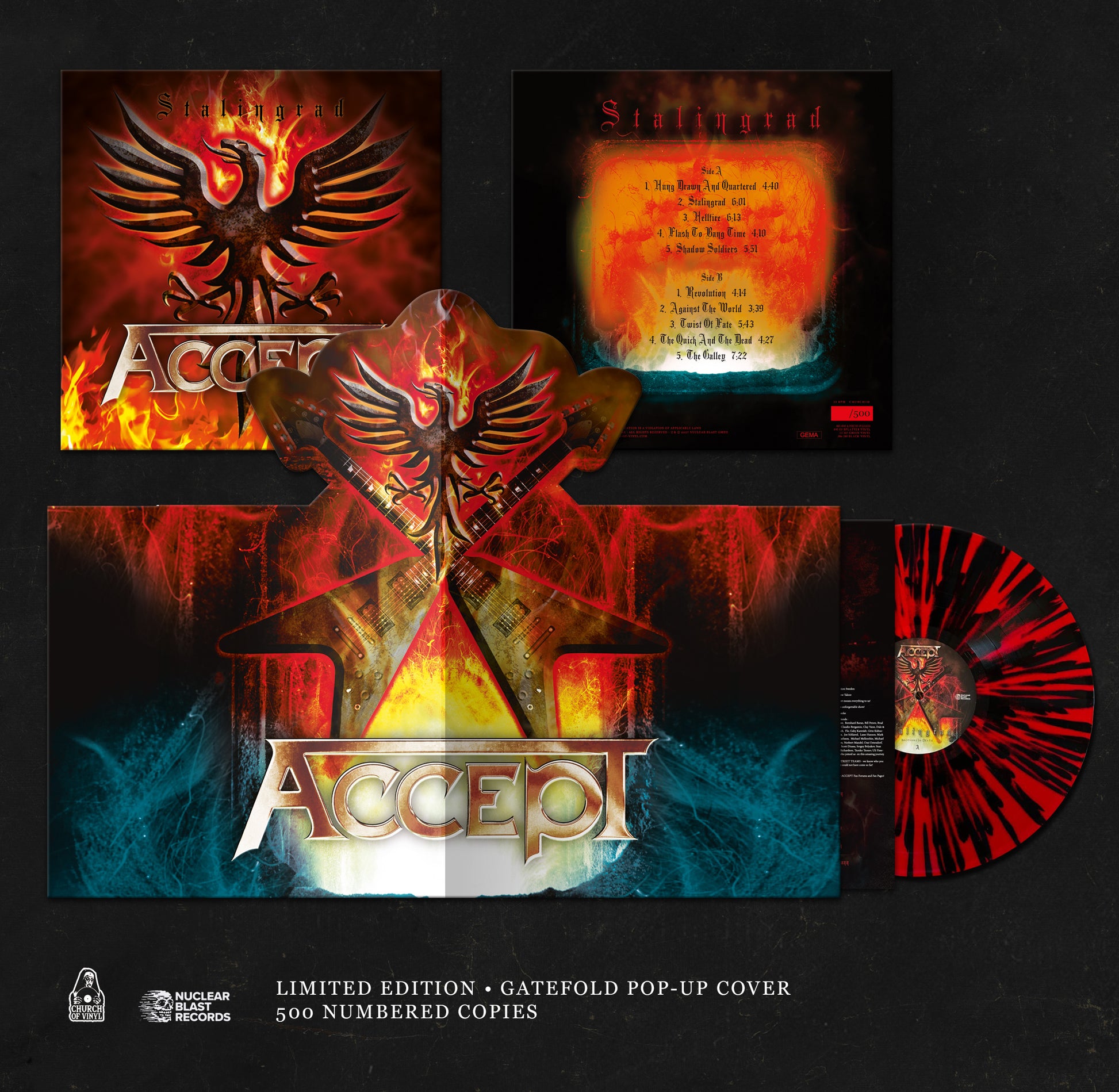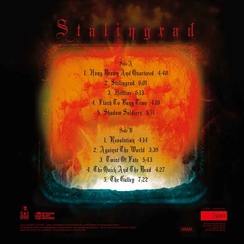 Our "Stalingrad” church of vinyl re-issue comes with an alternate cover artwork and a huge gatefold PopUp design. Hand numbered and strictly limited to 500 copies (001- 040 liquid filled vinyl, 041 – 110 splatter vinyl, 111 – 305 red vinyl and 306-500 yellow vinyl.