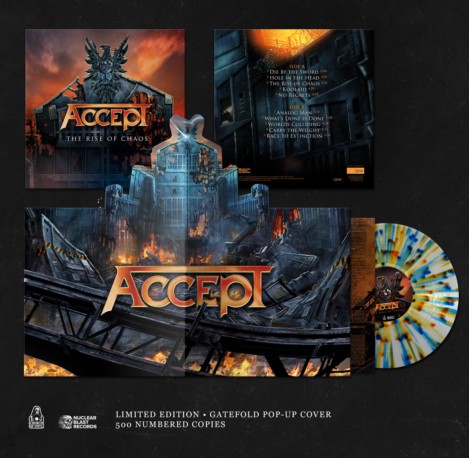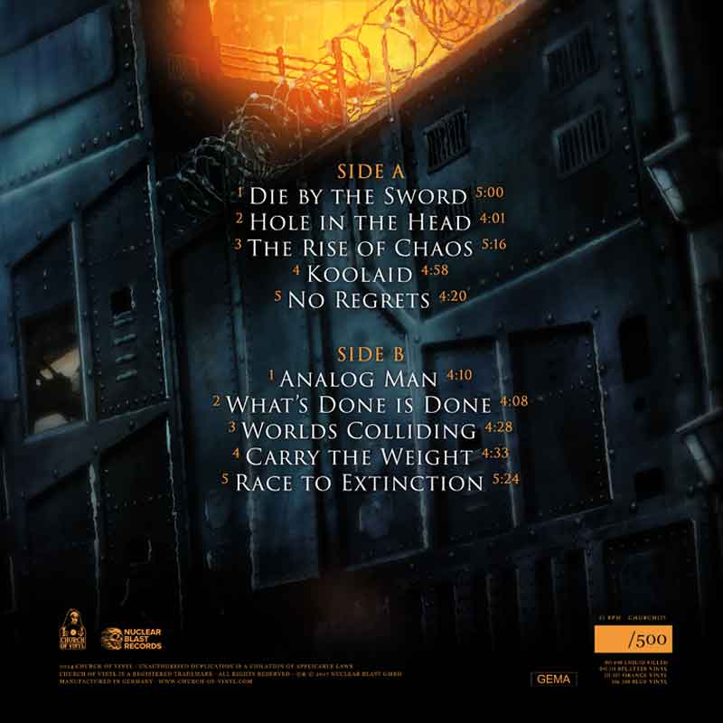 Our "The Rise Of Chaos” vinyl re-issue comes with an alternate cover artwork and a huge gatefold PopUp design. Hand numbered and strictly limited to 500 copies (001- 040 liquid filled vinyl, 041 – 110 splatter vinyl, 111 – 305 orange vinyl and 306-500 blue vinyl.