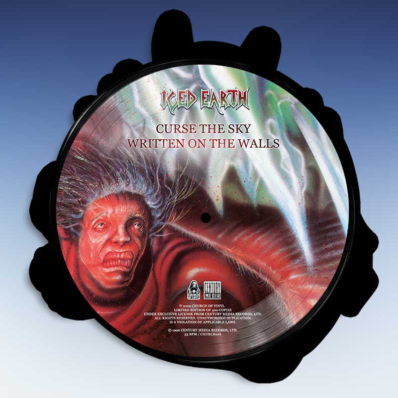 Iced Earth is an American heavy metal band formed in Tampa, Florida, and currently based in Columbus, Indiana. They were formed in 1984 under the name the Rose, then Purgatory, by guitarist and main songwriter Jon Schaffer and original drummer Greg Seymour. Iced Earth released their debut album in 1990.The Iced Earth picture shape release contains 2 songs a) Curse The Sky and b) Written On The Walls. Taken from the Album “Iced Earth” from 1990. Special shape vinyl with inlay, strictly limited to only 400 copies / hand numbered 001/400. This shape marks number 2 in our Iced Earth run. After releasing the demo EP Enter the Realm (1989) and signing to Century Media Records, the band released two full-length studio albums – Iced Earth (1990) and Night of the Stormrider (1991)